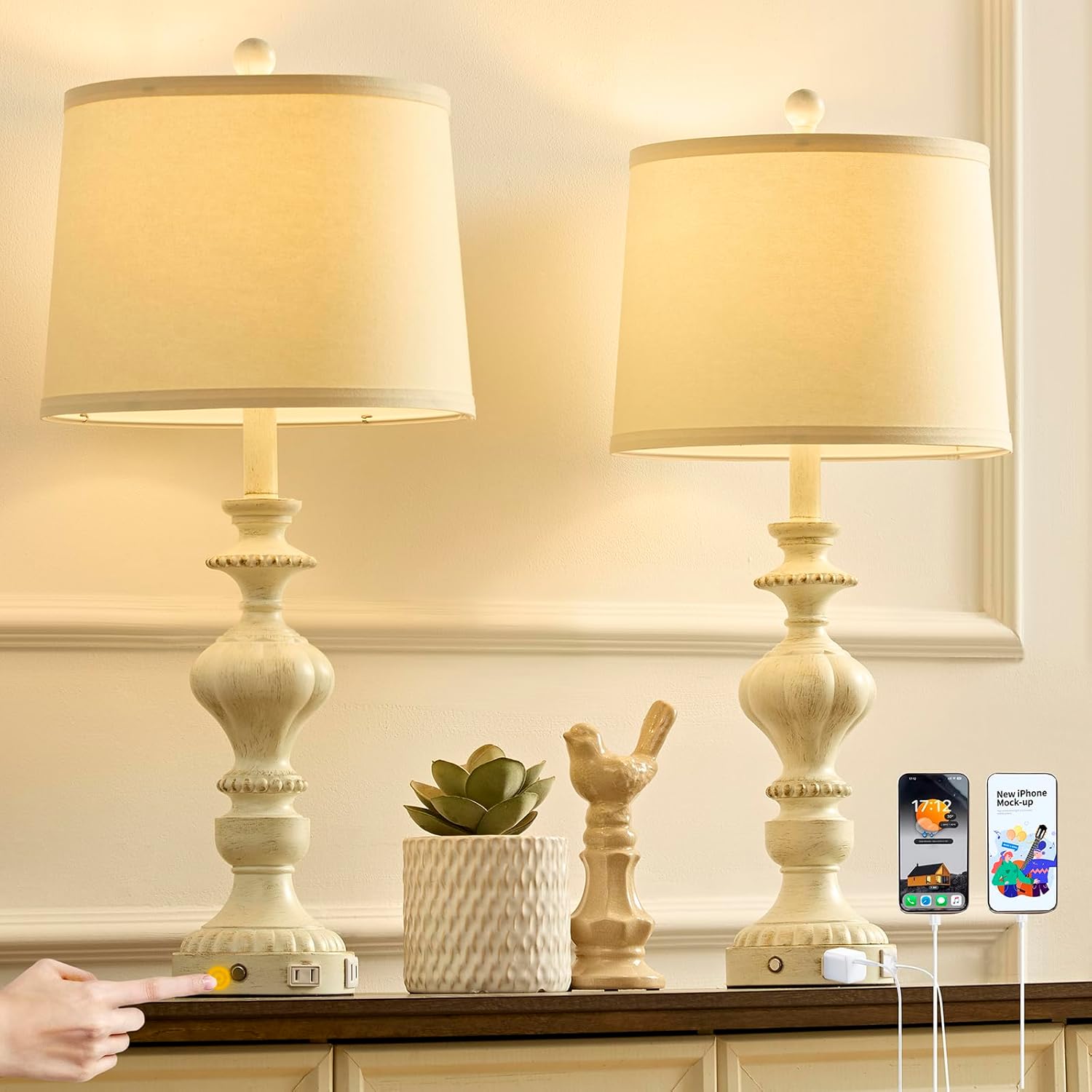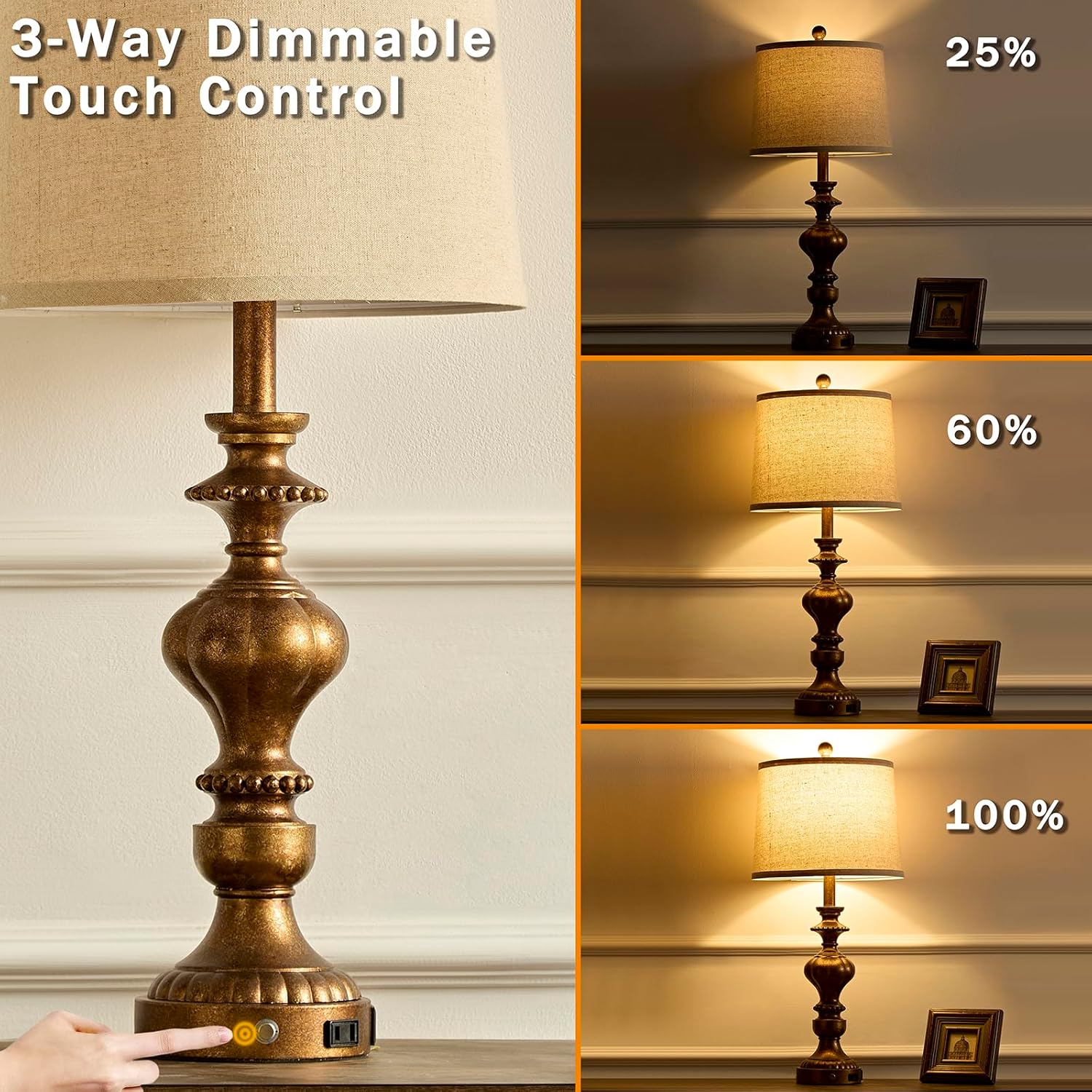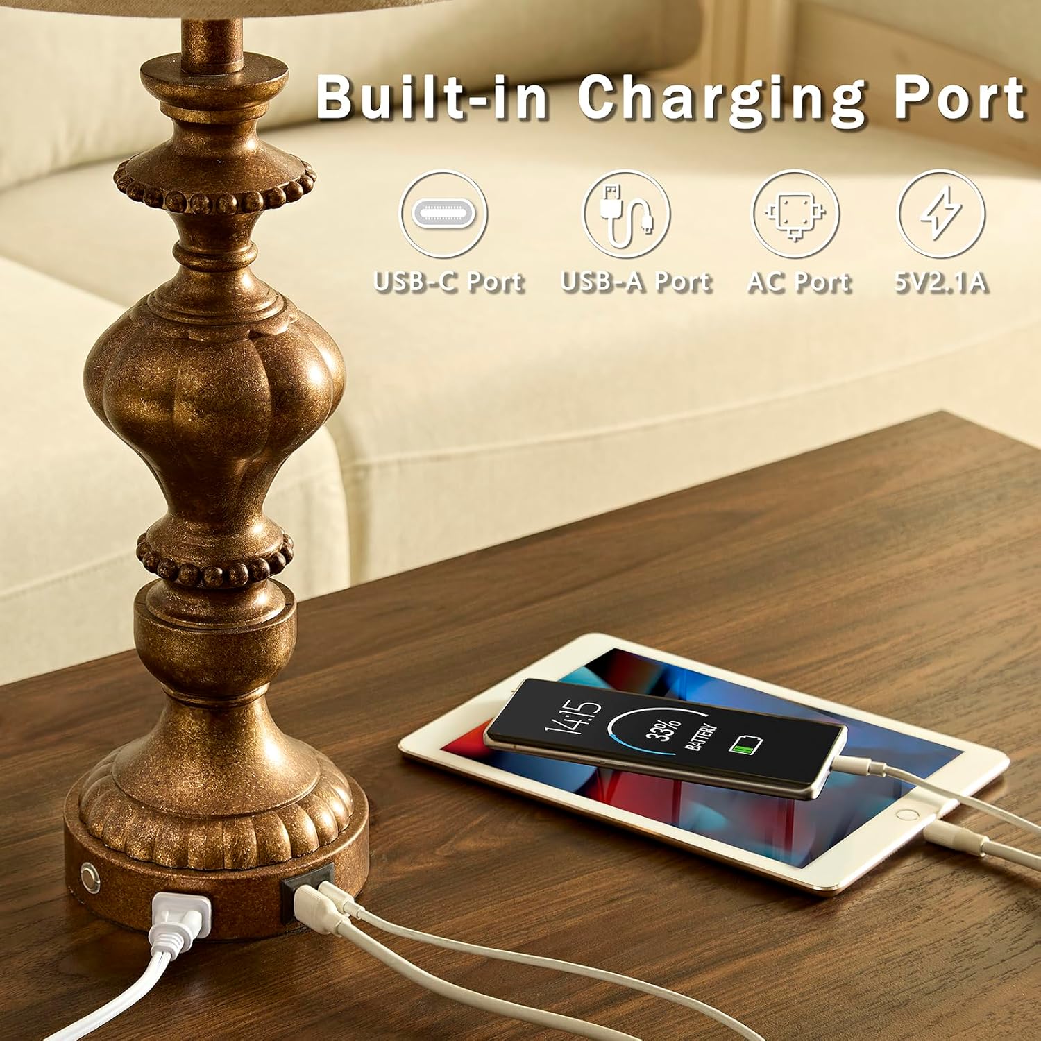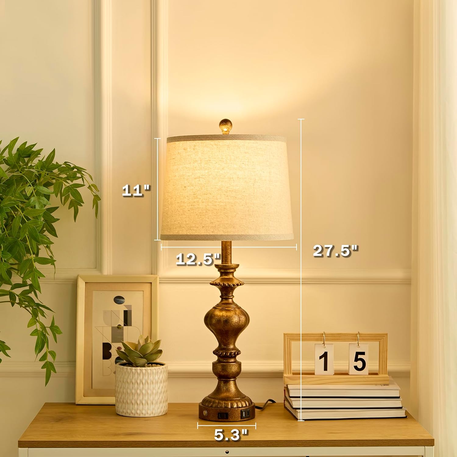 27.5" Farmhouse Table Lamps Set of 2 Bedside Nightstand Lamp with USB C+A Ports & AC Outlet, 3 Way Dimmable Touch Lamps for Bedroom Living Room Office Hallway Rustic Traditional Lamp (Copper)