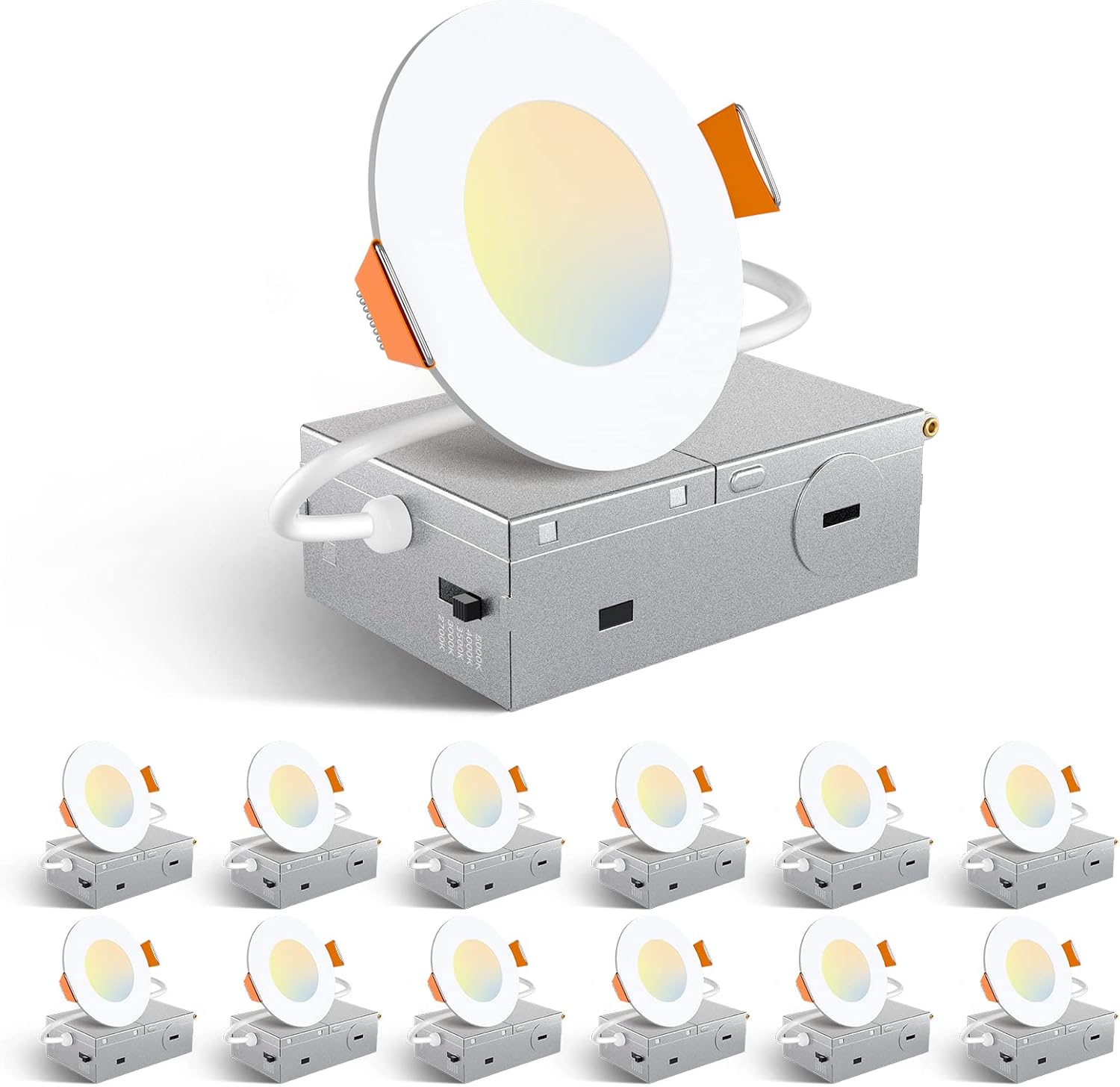 Amico 12 Pack 6 Inch 5CCT Ultra-Thin LED Recessed Ceiling Light with Junction Box, 1050LM Brightness, Dimmable Canless Wafer Downlight, 12W, ETL&FCC