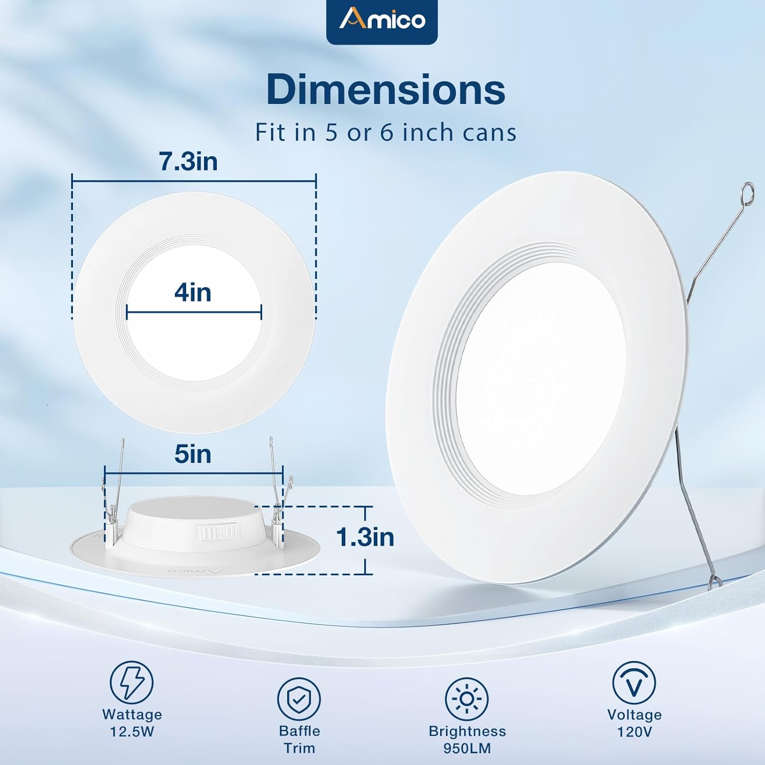Amico 24 Pack 5/6 inch 5CCT LED Recessed Lighting, Dimmable, 12.5W=100W, 950LM, 2700K/3000K/4000K/5000K/6000K Selectable, Retrofit Can Lights with Baffle Trim, IC Rated - ETL & FCC, White
