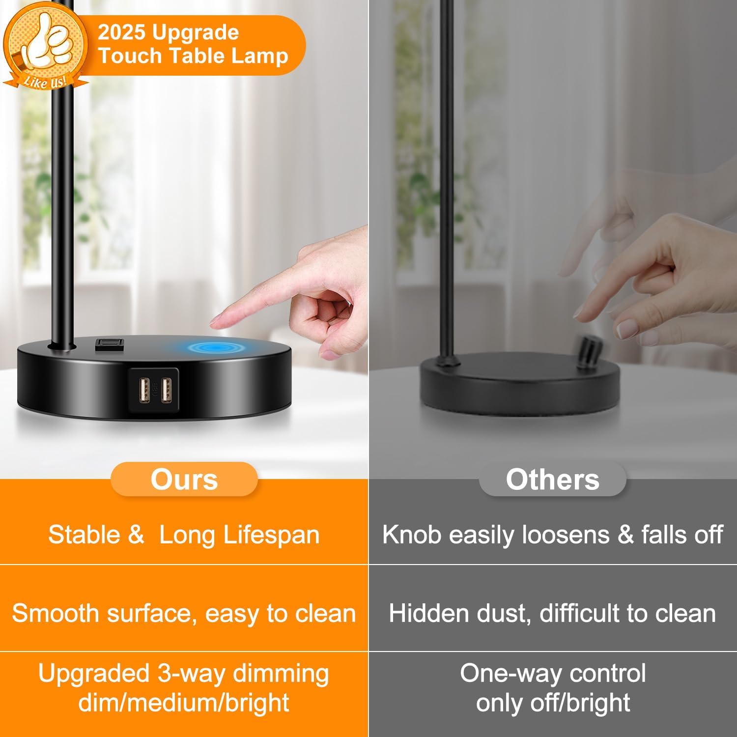 Set of 2 Industrial Touch Control Table Lamps with 2 USB Ports and AC Outlet - 3-Way Dimmable Black Bedside Lamps Nightstand Desk Lamps for Bedroom Living Room, Glass Shade & 2 LED Bulbs Included