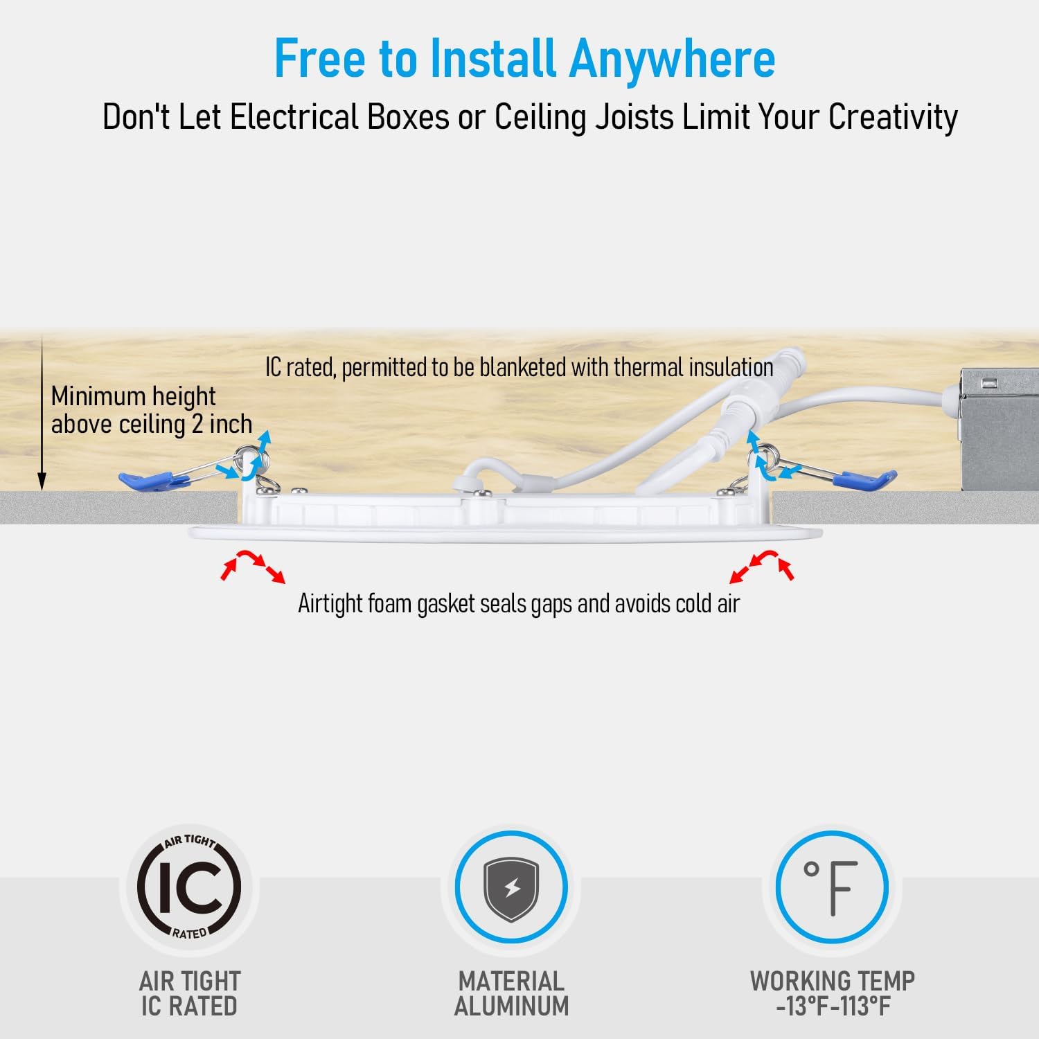 The ultra-thin design allows you to install this light from below the ceiling. Only 2 inches of clearance is needed, making this light perfect for retrofit, remodel or new construction installation.
